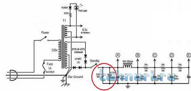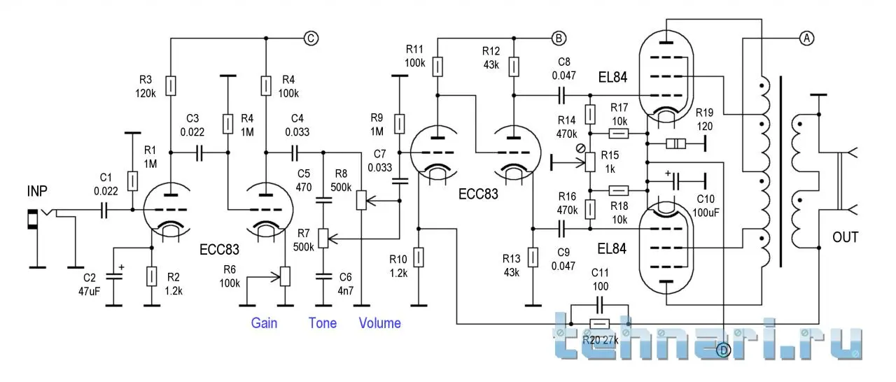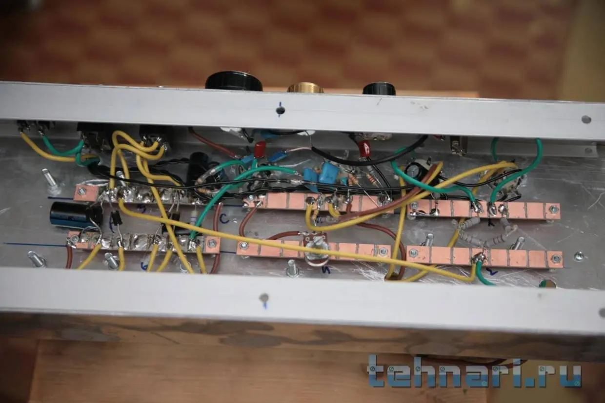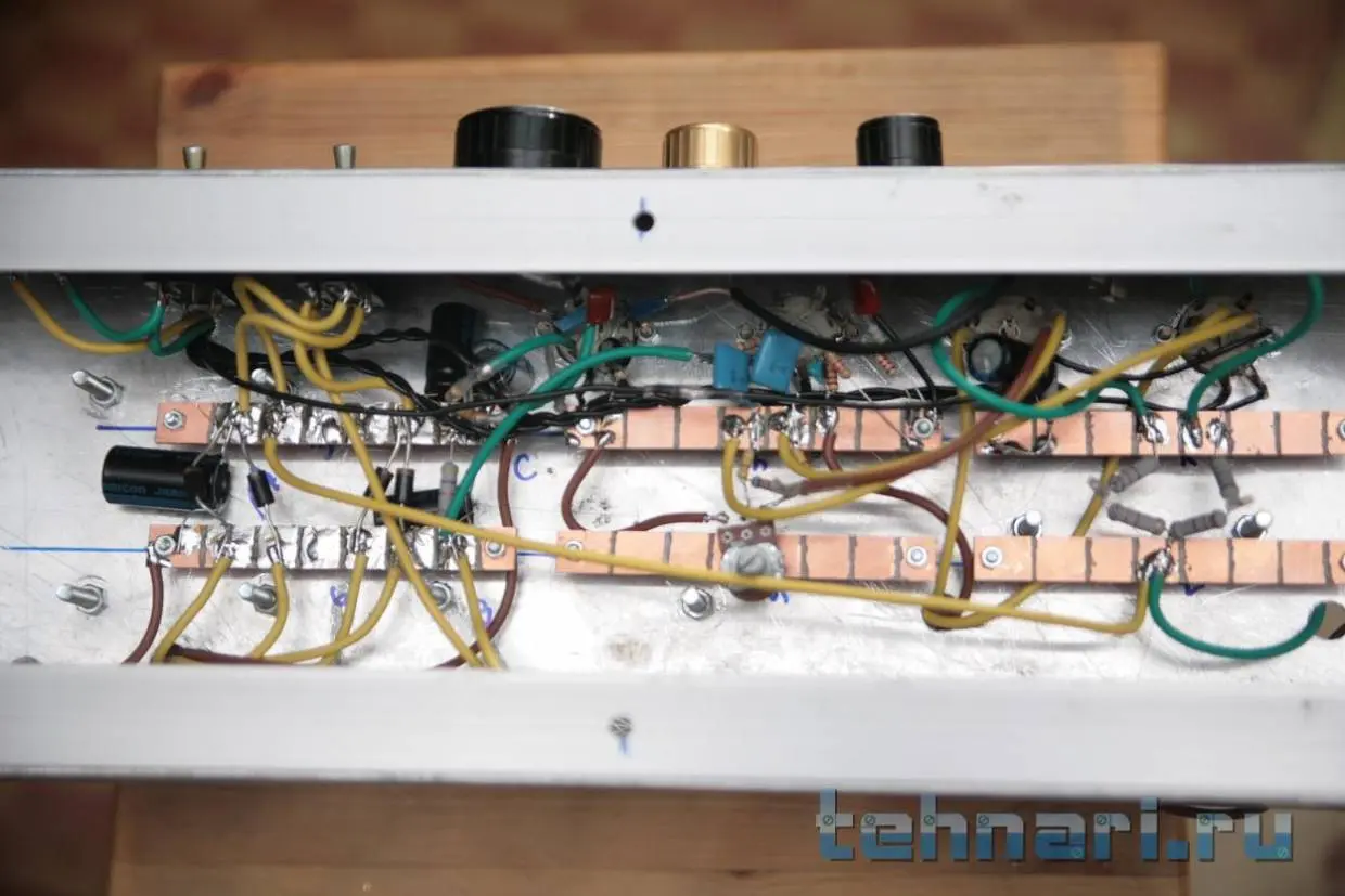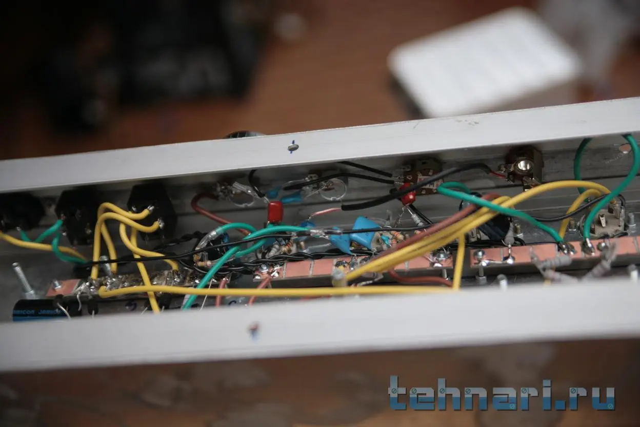 Покрутил резистор, тот, что на точку Д идет, чуть убивилось фона, выкрутил в ноль, там что-то пыхнуло внутри шасси(через дырку увидел), что пыхнуло - не нашел, на работоспособности не отразилось, оставил ручку как есть. Может мне показалось... И вопрос, корпус этого переменника же не имеет права контактировать с землей? я его пока подвесил, т.к. если на землю опустить он вроде как замыкает анодное или что-то в этом роде, в общем звонится там что-то.