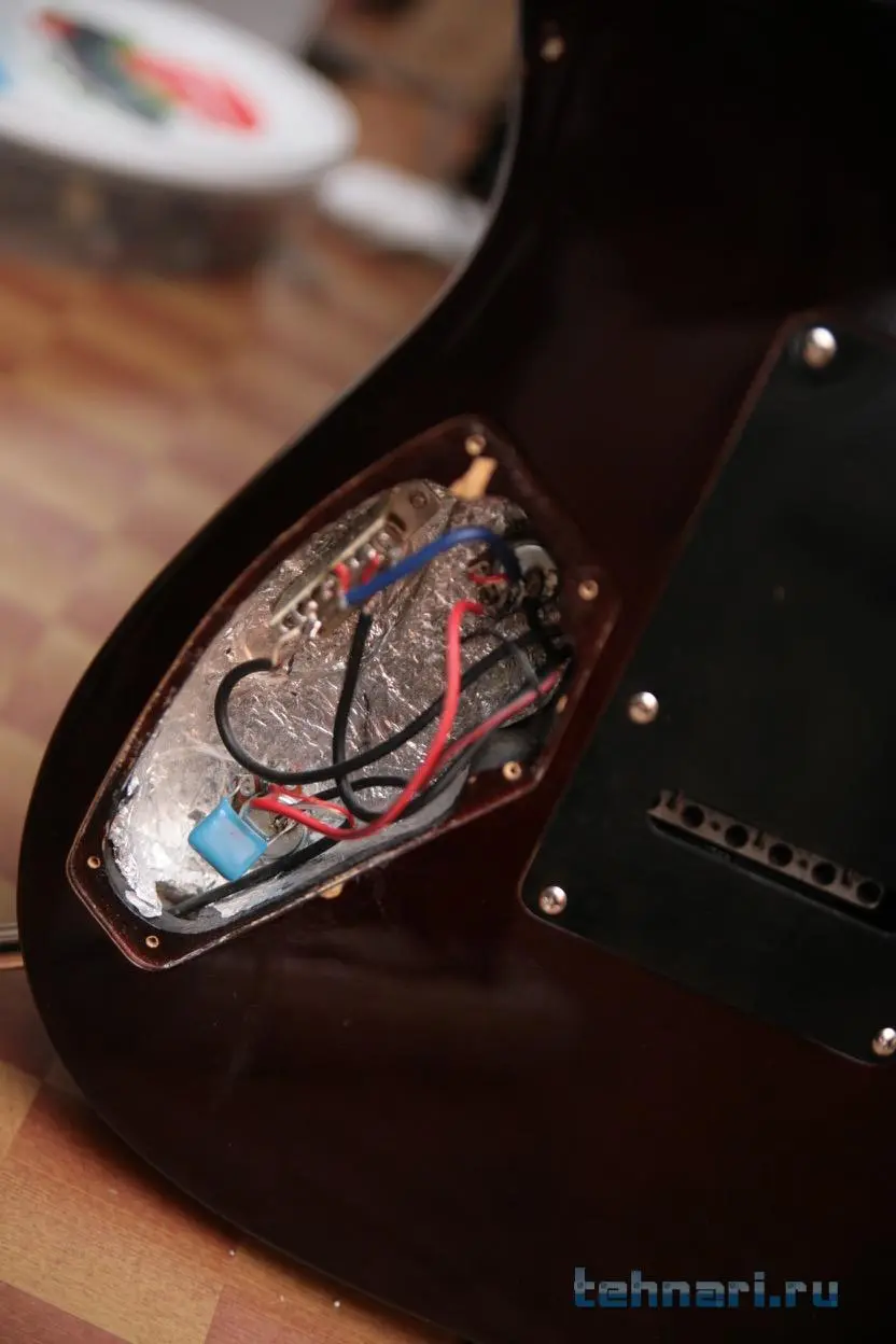Если коснуться рукой джека на гитаре, фон с неё практически пропадает, правда, если коснуться струн другой рукой он опять появляется, но зато на открытых побацать можно