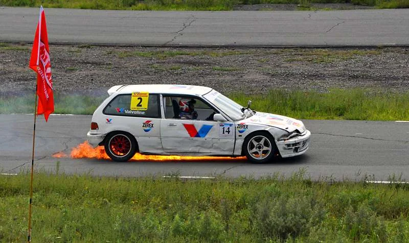 Последние три фото - не обошлось без неприятностей. Вспыхнуло одно из авто участников шоссейных гонок.