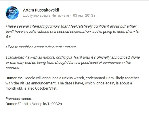 Как мы уже знаем, нам презентуют Android 4.4 KitKat, Nexus 5 и может быть Nexus 10. Теперь к этому списку добавились еще и Смарт-часы.