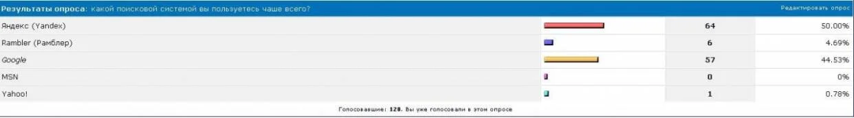 Только данный опрос считаю не целесообразным, потому как помимо гугла и яндекса есть еще поисковые системы, тот же рамблер, маил и т.п.
