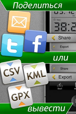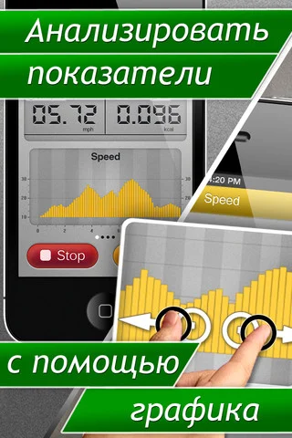 - возможность вести статистику: время, скорость, расстояние, калории, местоположение и высоту над уровнем моря;