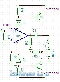 вот схема для стаб. питания . Т1 кт 827 Т2 кт 825.питание оу подбирается выбором стабилитронов из д815. выбрал их из-за маленького дифф.сопротивления. пит по 29в. мощность примерно 55 вт на 8 ом.