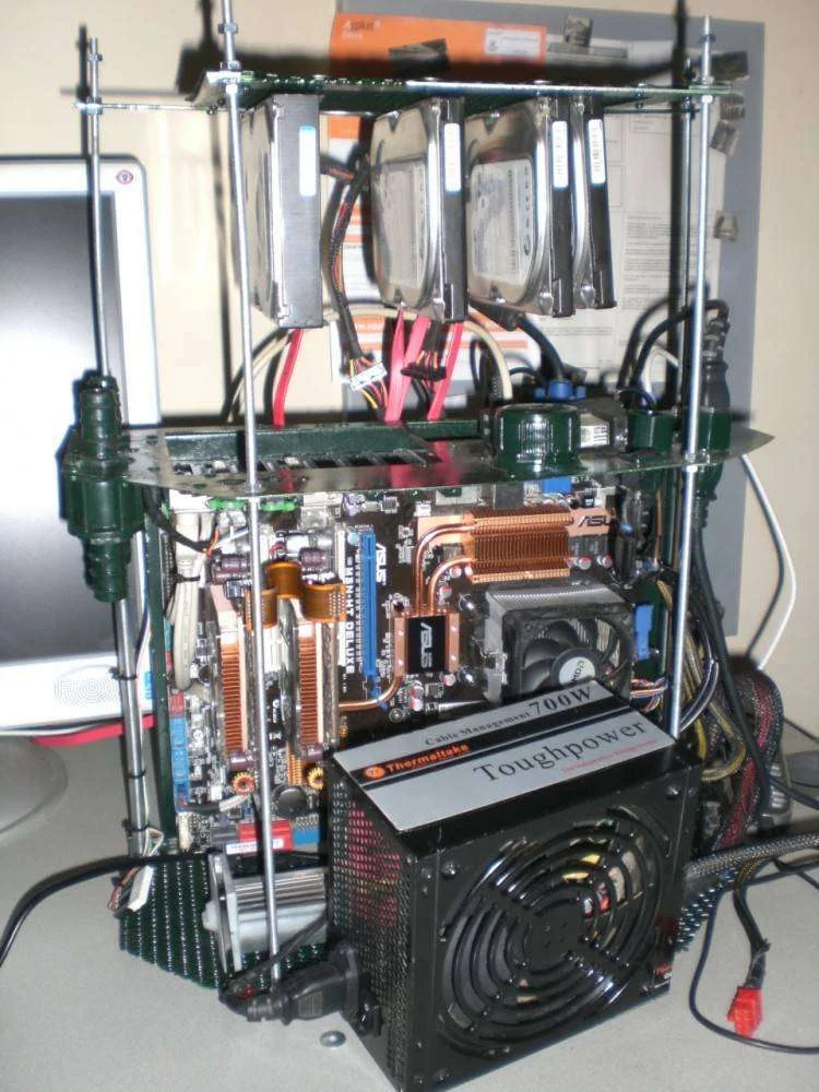 Готовил компьютер к утоплению (см. этот топик http://www.tehnari.ru/f133/t32172/index5.html#post283622). Комп при этом был в таком состоянии (см. фото). Обнаружил, что кнопка power не работает. Стал запускать, замыкая соответствующие пины на матплате. В какой-то момент проскочила искорка (возможно замкнул что-то не то).