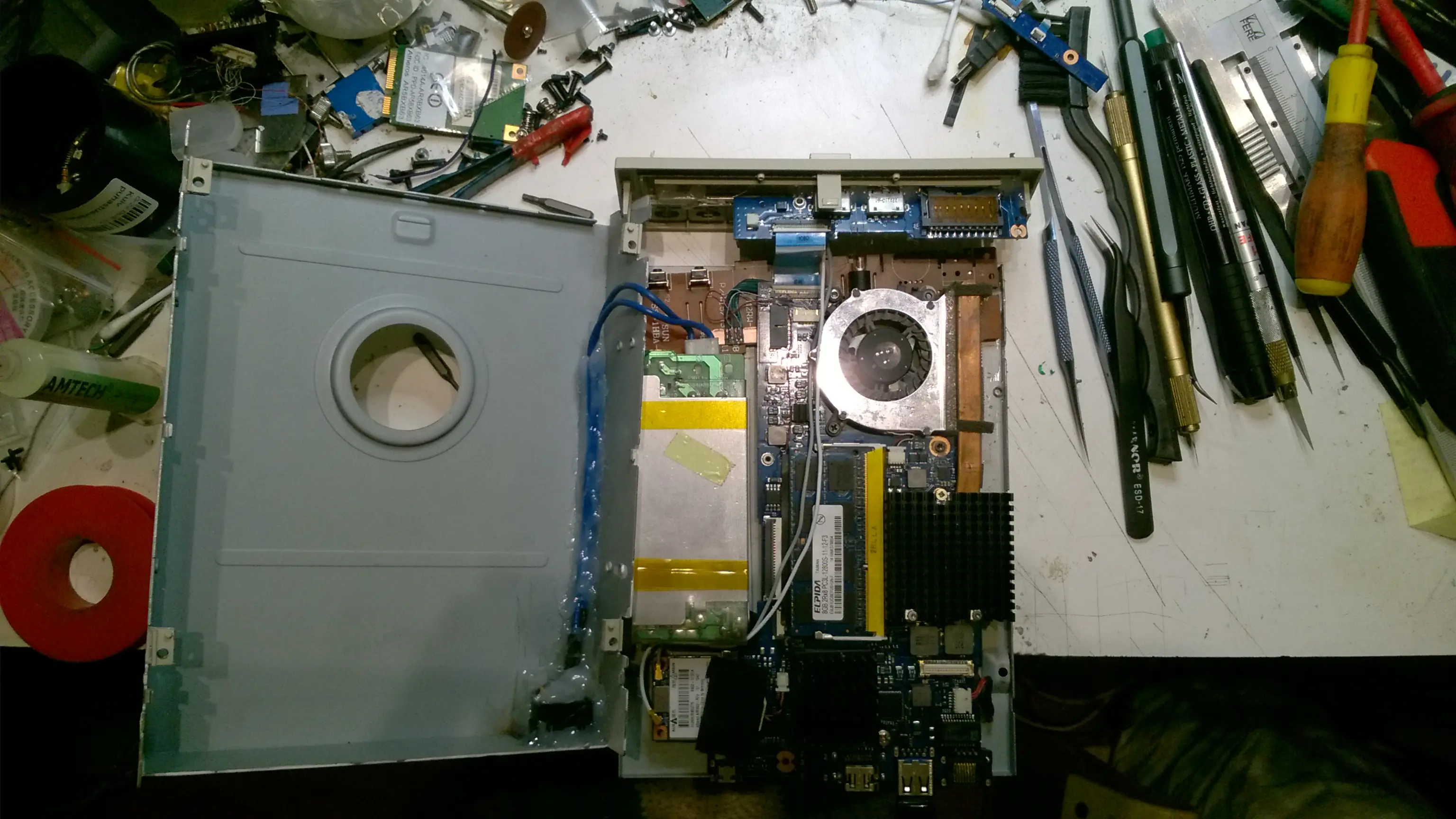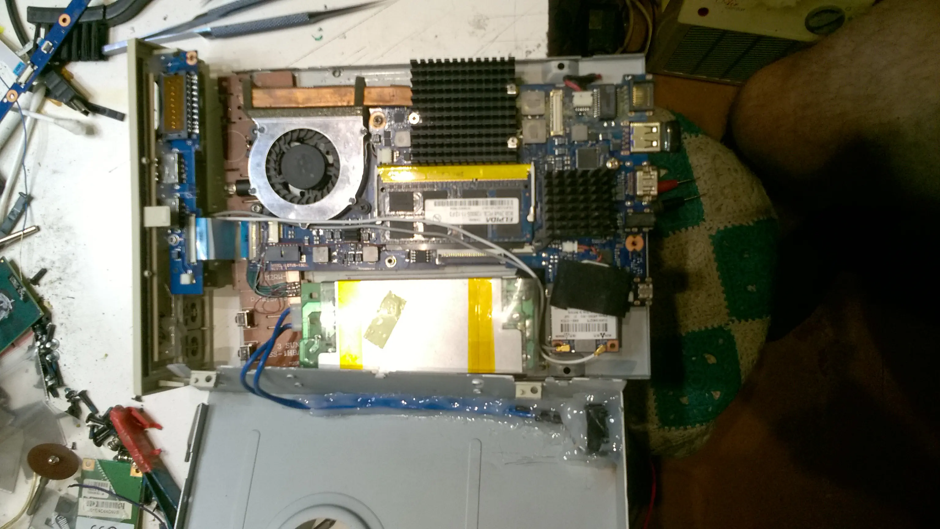 вобщем был у меня убитый в усмерть нетбук NP535 гнусмас, разбито в нём всё, отдали на запчасти, из живого только мать, прикинул так и сяк, и вот что в итоге получилось, плата идеально влезла в корпус от старенького оптического драйва, причём даже питатель туда влез, и получилось очень даже неплохо, ну конечно можно загрунтовать, покрасить, но это пока уже не важно, уст-во работает и его не видно.. установлена 10-я винда (на фотках харда не видно, он на верхней части пока, потом поставлю SSD под плату, там как раз место есть...), клава-мышь беспроводная на одном датчике, выход на телек через HDMI, установлен KODI, для телека и m3u, всё остальное в штатном режиме, немного облегчено, при полной нагрузке холодный как лёд, кулерами шуршит редко (стоит 2 кулера, свой на проце и второй общий на крышке от ноута).. ну вообщем фотки..