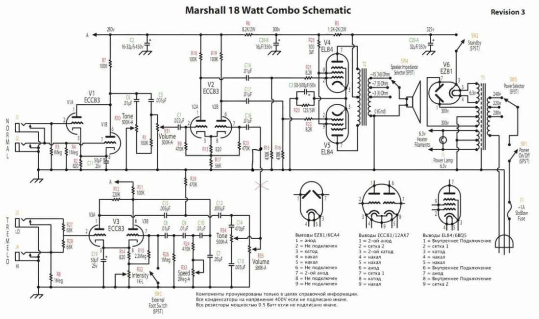 Все же я выбрал схему усилителя Marshall 18 Watt.