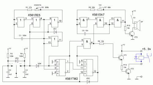 И так, "игрушка" имеет 2 кнопки, одна издающая короткий сигнал (точка) постоянно, а другая издает повторяющийся сигнал в виде более длинного сигнала (тире) тоже повторяющийся. Все это никуда не передается, а прямо на месте пищит. Все дело на батарейках, без подключения куда либо. За ранее спасибо кто поможет