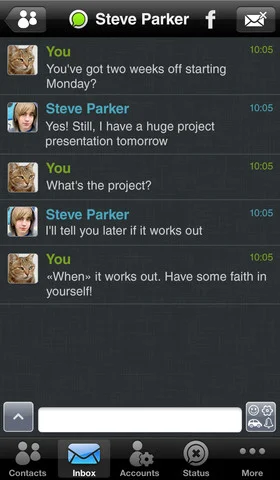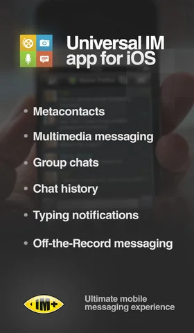 IM+ Pro – один из лучших и удобных по своему функционалу мессенджер, объединящий в себе такие сервисы, как ICQ, Yahoo, Skype, MSN, Facebook, Mail.Ru Агент, Яндекс Чат, Google Talk, ВКонтакте, Одноклассники, Twitter и др. Прекрасно реализованный функционал данного приложения в сочетании с ярким и удобным дизайном, позволит Вам оставаться всегда на связи со всеми Вашими друзьями и партнерами. Удобный список контактов, разделенный по группам, возможность смены обоев и смены голосовых уведомлений. Поддержка PUSH-нотификации.