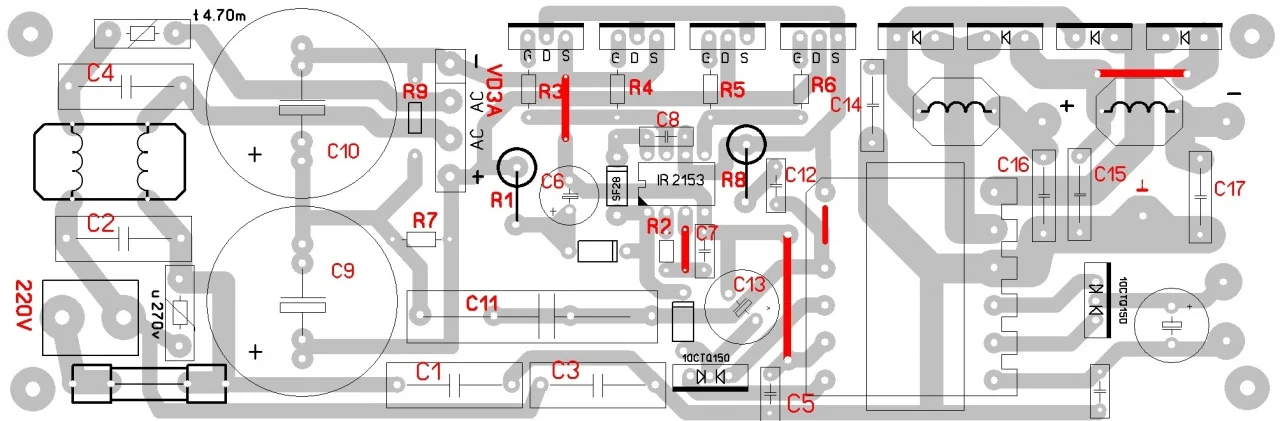 2.Неиспользуемый участок платы за транзисторами это место отведено под радиатор, место которое отведено под трансформатор я так думаю нужно полностью переделывать (я там намудрил, трансформатор с касой.