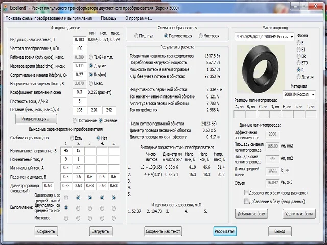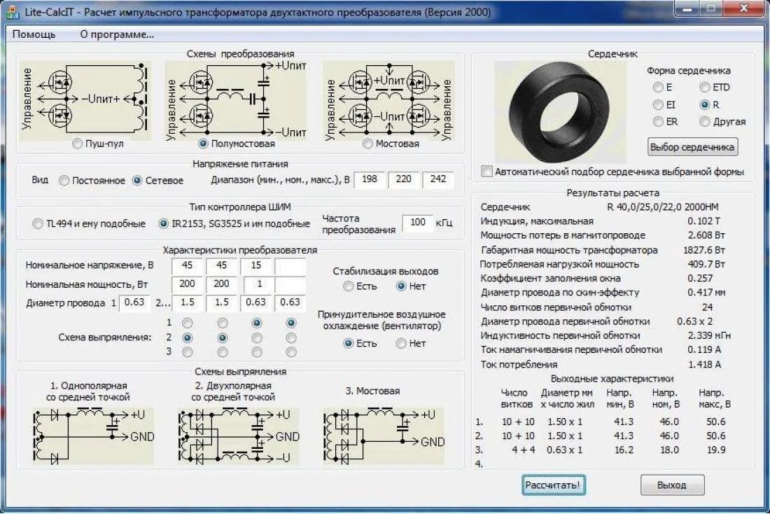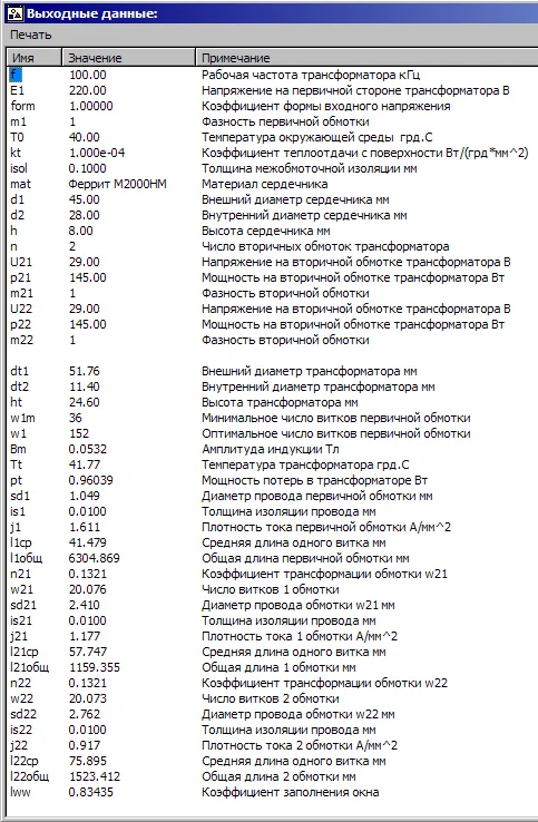 Вторичку нельзя мотать проводом 1,5 (это импульсник а не силовой) надо мотать более тонким в несколько жил. Укажите в программе вторичку тоже проводом 0,63мм. И не надо два раза указывать 45В, вы ведь один раз указали 45 с отводом от середины :)