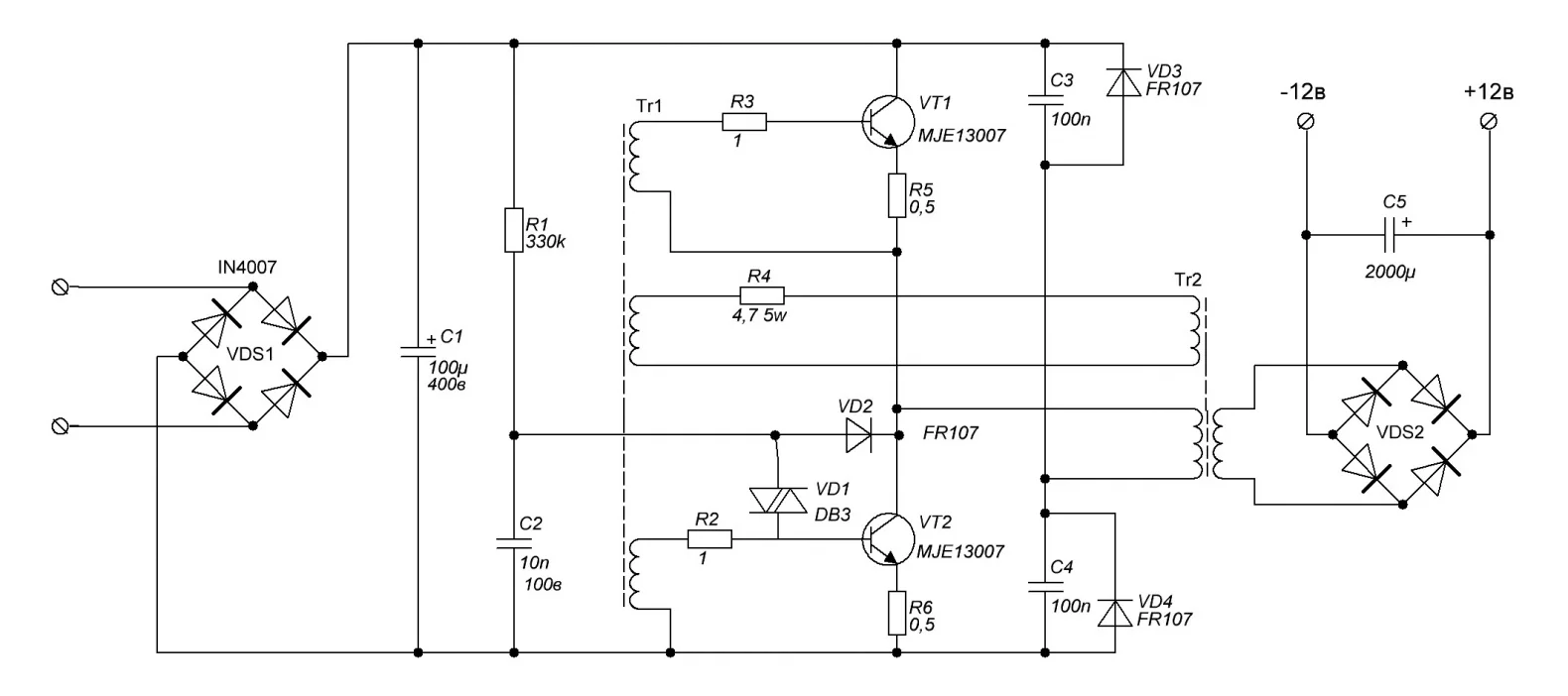 Валялся у меня импульсный бп для галогенок, покапался в интернете - нашел как запустить его без нагрузки. Запустил: на выходе поставил диодный мост и получил ~12в. Все было ок. Начал экспериментировать с нагрузкой. Подключал автомобильную магнитолу, лампочку 12в, но после подключения галогенки (опять же автомобильной) бп "пыхнул"). После проверки поменял транзисторы (были J13007), 2 резистора по 1ом и 2 по 0,5ом. Остальное вроде цело. Но бп работать не хочет. В чем может быть проблема? Может я неправильно резисторы определил (коричневый-черный-золотистый-золотистый-зеленый - 1ом и зеленый-черный-серебристый-золотистый-красный - 0,5ом)?