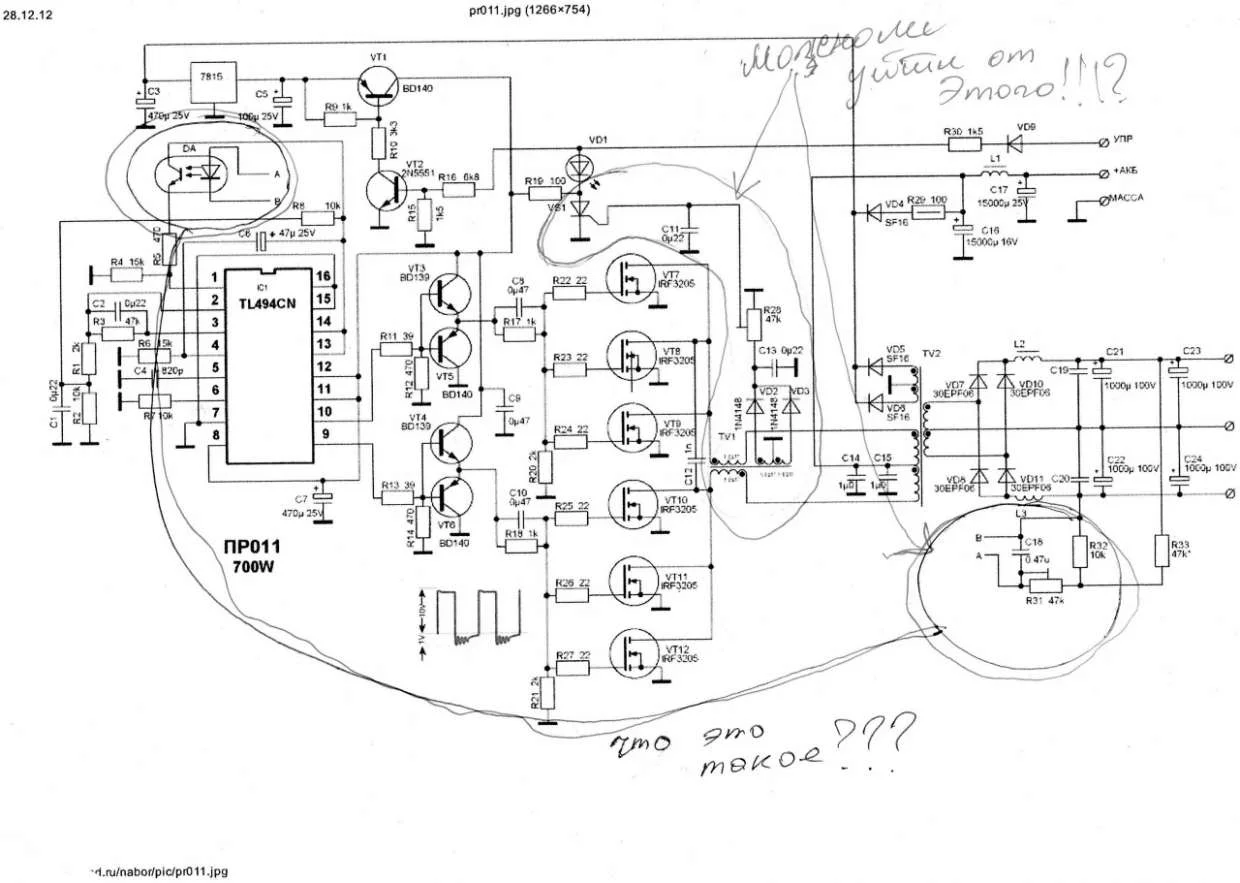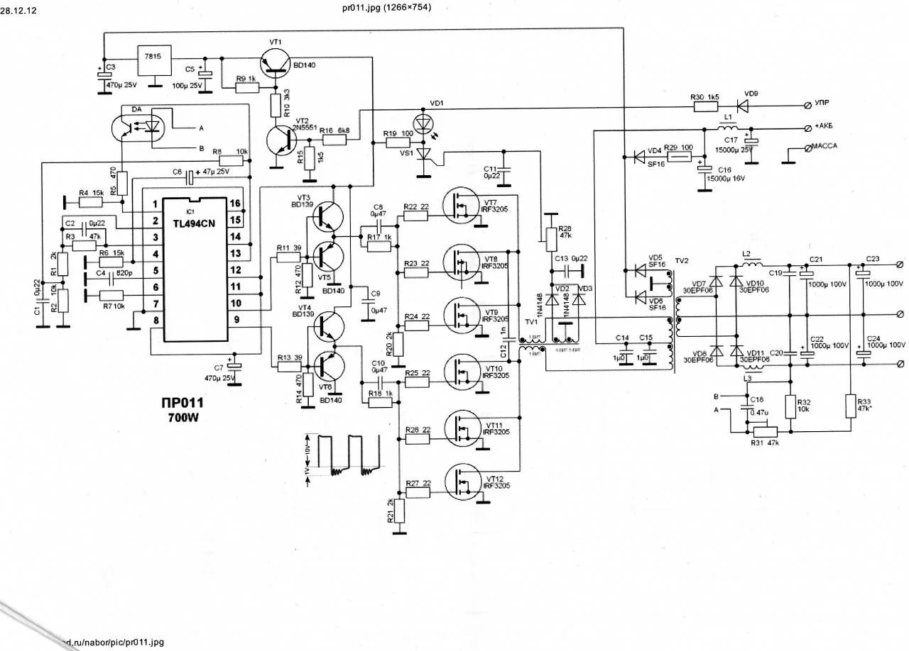 Эта схема не представляет интереса, при мимолетном рассмотрении, сразу возникло множество вопросов. Это скорее всего черновой набросок какого то разработчика, но при этом уже в схеме миллион ошибок. Как то, зачем в схеме преобразователя гарантированная обратная связь микросхемы по питанию. Зачем стабилизатор 7815, если в сети авто больше 14.5В не бывает, тем более через резистор 100 Ом и диод SF16, даже если на входе стабилизатора 7815 будет 15-16В он нормально работать не будет. Далее, на выходе два параллельных электролита, по 1000 мкФ, ну это вообще абсурд, почему не один, допустим 2200 мкФ и то при мощности и токах такого преобразователя - 700Вт, на выходе должно быть минимум 10.000 мкФ и т.д., дальше не буду рассматривать эту схему как основу для построения нормального преобразователя, тем более TL494 сложна в управлении ...а можно-ли это в схеме не использовать?