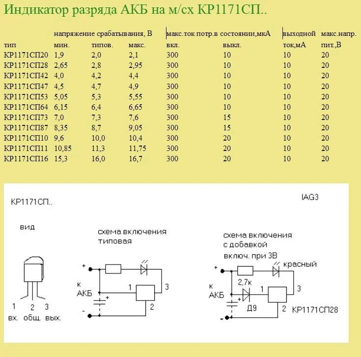 Ниже представлена схема простого индикатора минимального рабочего напряжения. Схема отличается простотой изготовления, малым током потребления. Рабочее напряжение 6-24 Вольта. Ток потребления без индикации (ждущий режим: 60-240 mkA) и в режиме индикации: 1.5-6 mA.