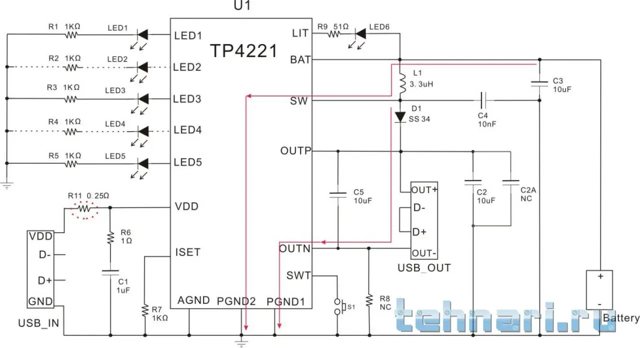 Если вы внимательно будете смотреть в схему то отпадут лишнии вопросы. Эта схема и есть power bank. Через нее и заряжать акб, и она же повышает до 5в. И она же показывает индикатор заряда. Посмотрите в схему, есть разъем входа, разъем выхода, и аккумулятор. Тогда вопрос зачем что то добавлять? Если уже все готово.