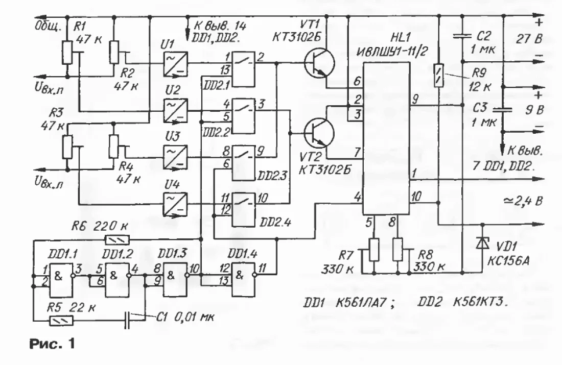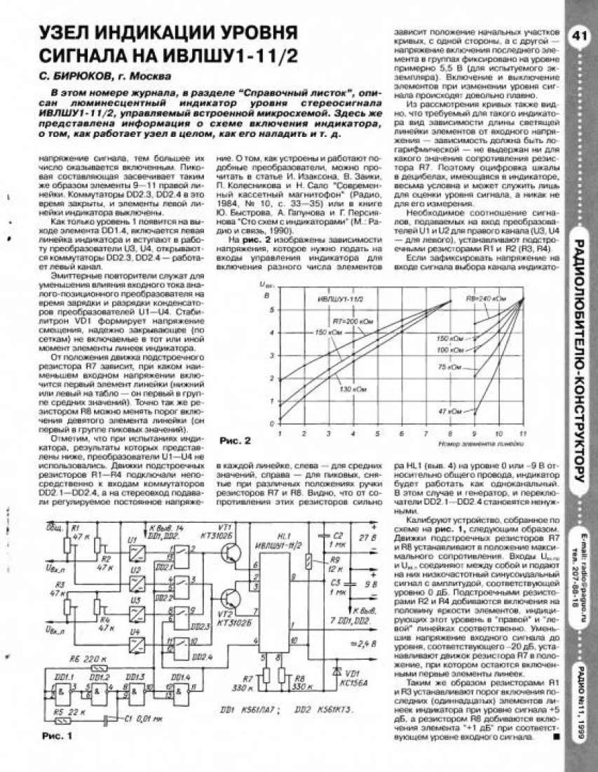 " Отметим, что при испытаниях индикатора, результаты которых представлены ниже, преобразователи U1-U4 не использовались. Движки подстроечных резисторов R1-R4 подключали непосредственно к входам коммутаторов DD2.1-DD2.4, а на стереовход подавали регулируемое постоянное напряжение. О том, как устроены и работают подобные преобразователи, можно прочитать в статье И. Изаксона, В. Заики, П. Колесникова и Н. Сало "Современный кассетный магнитофон" (Радио, 1984, # 10, с. 33-35) "