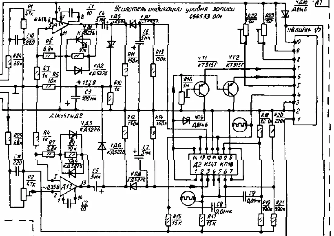 Обычно этот индикатор использовали для индикации сигнала записи. Поэтому на вход ставили операционники по инверт. и неинверт. схемам и с них сигнал выпрямлялся диодным мостом....