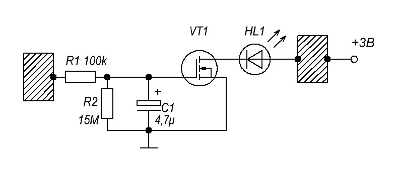 Если прикоснуться к обоим пластинкам пальцами, то через несколько секунд светодиод начинает плавно загораться. Чем сильнее сжимать (увеличивается площадь соприкосновения пальцев и пластинок) тем ярче загорится в итоге светодиод...
