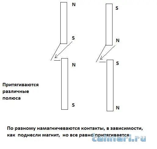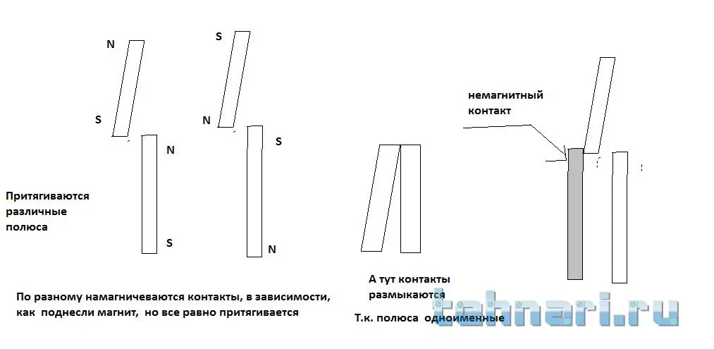 Попробуйте провести такой эксперимент- поднести к геркону магнитик. Осторожно. Вначале одним полюсом. Потом другим. Не объясните, почему в одном случае контакт притягивается, а в другом отталкивается?