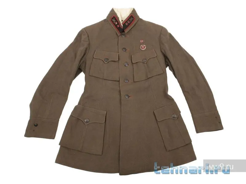 Нашел нечто похожее. Суконная рубаха-френч лейтенанта артиллерии РККА образца 1924 года. Знаю, что разрешалось донашивать форму старого образца(старые запасы), если не было возможности выдавать форму нового образца. Правда не знаю, тот ли это случай. И почему он без знаков отличия на фото.