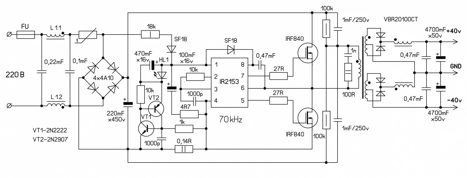 Просмотрев множество схем ИИП на IR2153, решил слепить свой. Хоть схема изначально разрабатывалась на 70 ватт, замена некоторых деталей на более мощные позволит выжать из неё 400 Вт и более.