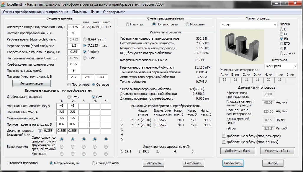 Трансформатор: первичка (первая половина) 32 витка провод 0.35 в 2-е жилы; затем две вторички по 21 витку провод 0.35 в 2-е жилы; и в конце вторая часть первички 32 витка провод 0.35 в 2-е жилы...........Хотя вот есть скрин: