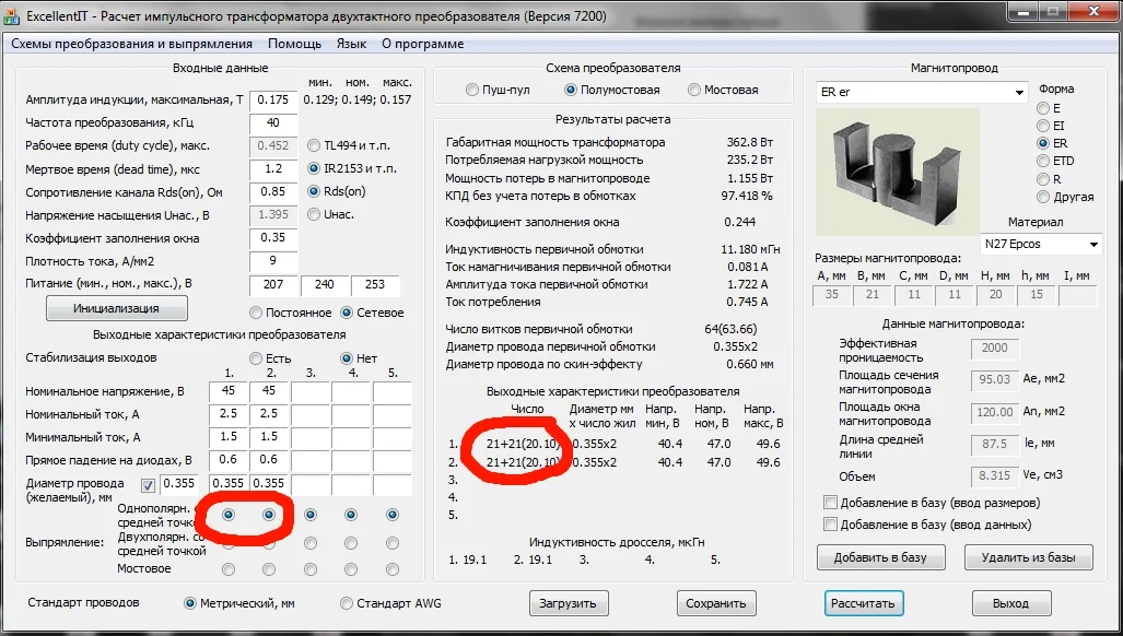 первичка (первая половина) 32 витка провод 0.35 в 2-е жилы; затем две вторички по 21 витку провод 0.35 в 2-е жилы; и в конце вторая часть первички 32 витка провод 0.35 в 2-е жилы