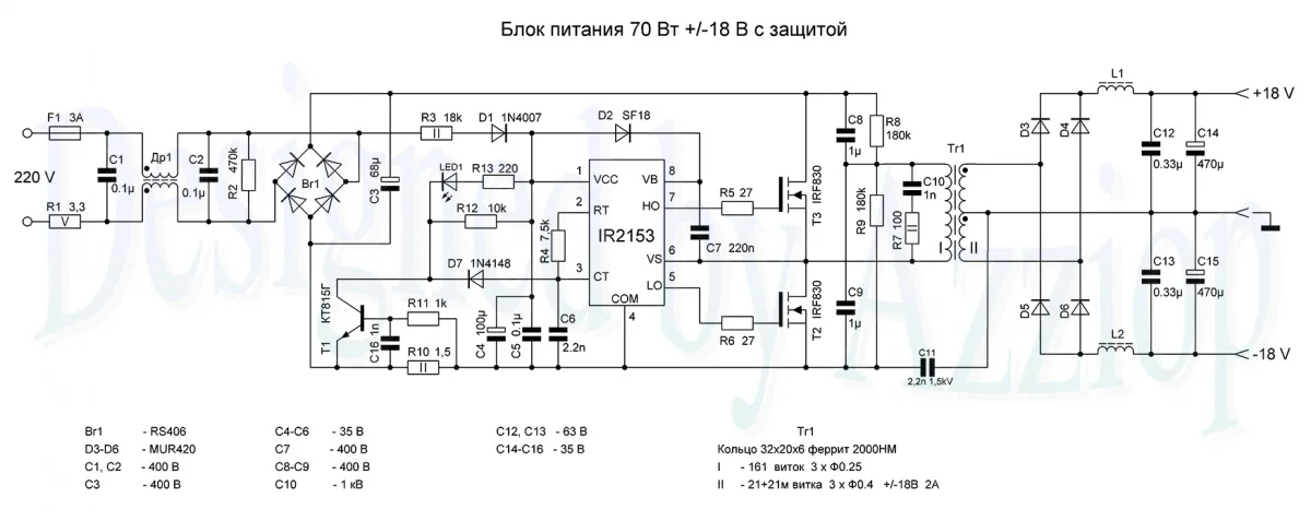 Собрал второй бп по Вашей схеме.... для унч на tda2050.... выход +/-18 вольт... Блок завелся сразу..... но на выходе всего-лишь +/-6 вольт Питание IR2153=15.8 вольт.