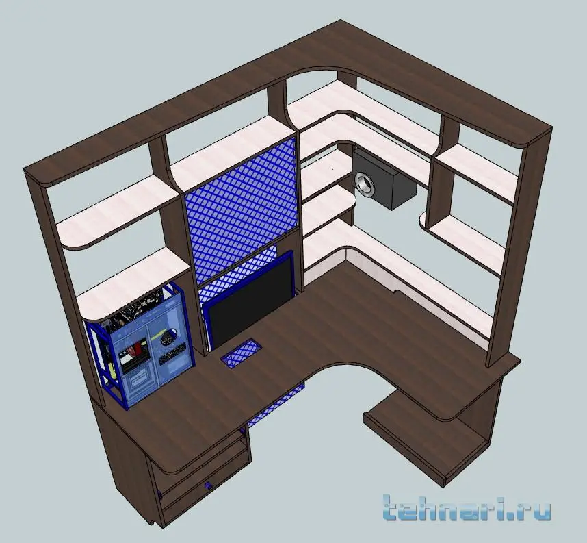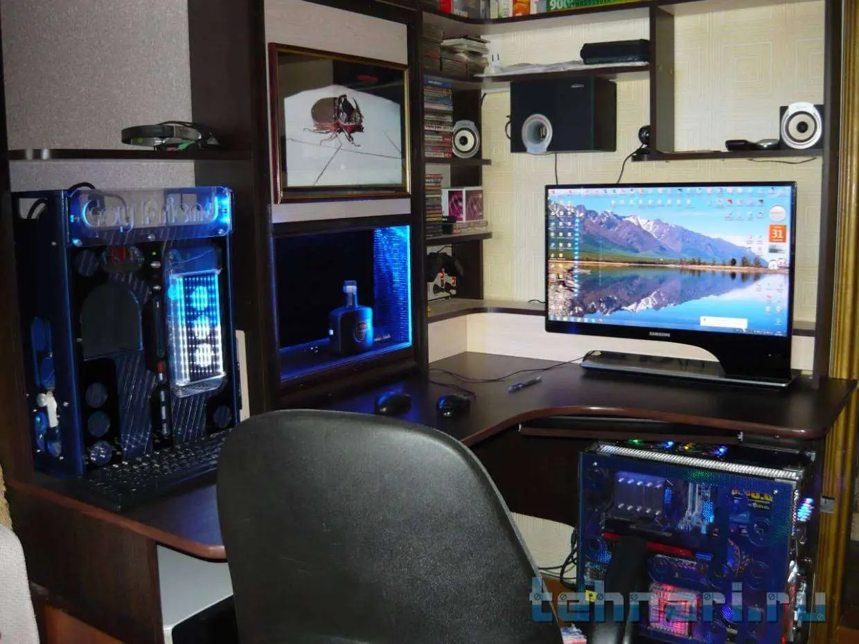 кто и как привык сидеть за пк, но я бы не смог сидеть за таким столом, так как ноги некуда девать если сидеть прямо напротив монитора что установлен справа.Самое простое и надёжное крепление это евровинт еврик как называют мебельщики