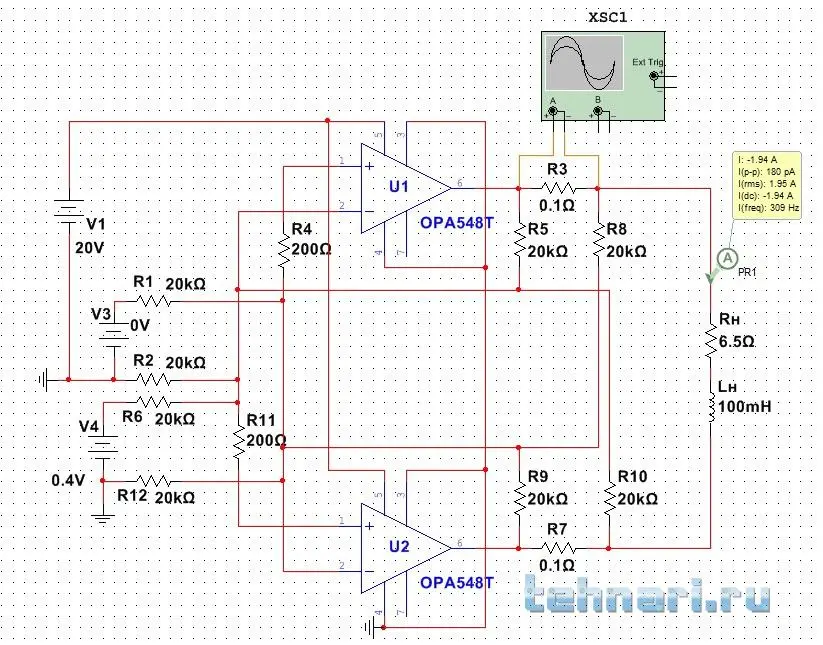 Нужен совет. Собрал схему ИТУН на ОРА548. Особенности: однополярное питание схемы, однополярное управление по входам OPA548, нагрузка индуктивная, ток в нагрузку до 2 А. Промоделировал в Multisim, работает. В живую не работает.В чем может быть причина? Может ли такая схема заработать при однополярном питании? Ранее собирал аналогичную схему на TDA2050. Не устроило двуполярное питание, большое собственное потребление микросхемы и отсутствие входа выключения. Всех заранее благодарю за потраченное время.