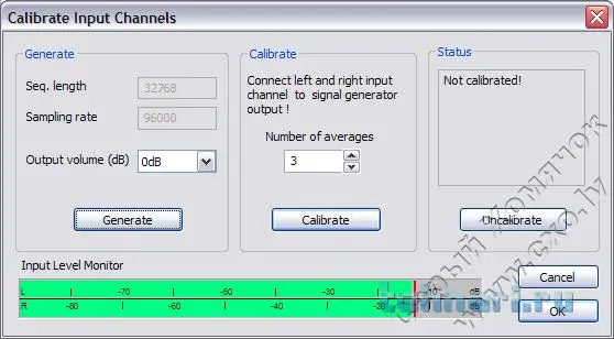Это меню предназначено для калибровки измерительного комплекса. Нас интересует только раздел Soundcard full scale output (mV). Здесь нажимаем кнопку Generate sinus (400Hz) и устанавливаем на выходе усилителя необходимое для теста напряжение. Никаких критических требований к величине этого напряжения нет, просто устанавливается не большая и не маленькая величина. Я установил по вольтметру 0.7041 v. Обратите внимание, что в поле Output level установлено значение -3 dB. После установки нажимаем повторно кнопку (теперь уже с надписью Stop Generator) и закрываем окно.