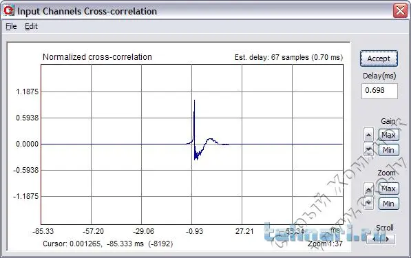 Фазовая характеристика, из-за отсутствия величины задержки, отображается с ошибкой. Автоматическое определение задержки производится через меню Record - Crosscorrelation/delay estimation (Figure 52).
