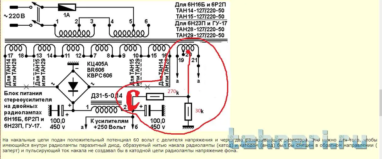 Я сейчас на смарте... Только писать могу... По закону Дома задаешься током делителя 5 мА и расчитываешь два резистора. В точке их соединения получаешь потенциал 20-30 В. Этот потенциал подаётся на среднюю точку накала ламп предусилителя. Поищи схемы в интернете. Должно быть это...