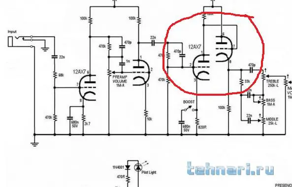 Я бы на накалы ламп предусилителя подал положительный потенциал что б запереть виртуальный диод между катодом и нитью. Делитель запитал бы с конденсатора из точки В или С.
