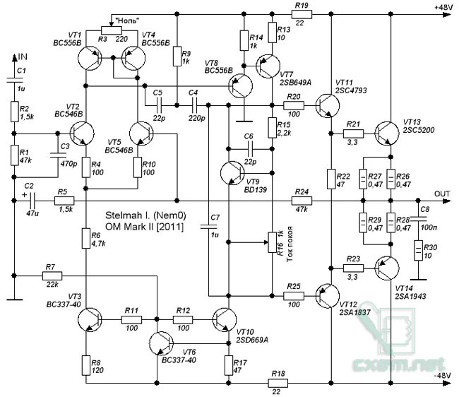 есть вариант по проще) замените транзисторы VT1 на КТ361К, VT2 на КТ850 с любой буквой, а последние два на КТ864А, так же конденсаторы замените тем же номиналом но повышеным допустимым напряжением и увеличьте напряжение питания. вот и все в принципе. транзисторы заменять только теми, которые я указал, у них очень высокая линейность линейность до 10МГц, да и ток покоя необходимо выставить 1А. при питании в 30вольт и токе покоя 1А будет вам 30Вт в режиме класса А.