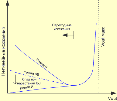 2) Вот типичный график искажений разных типов усилителей.
