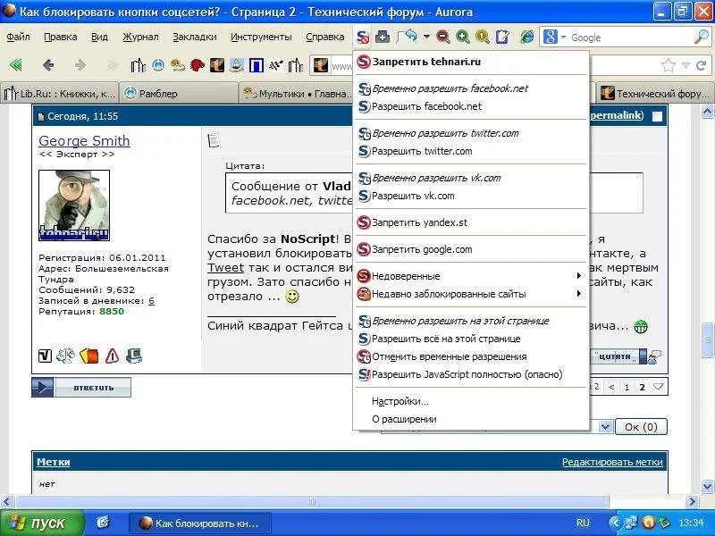 Спасибо за NoScript! В подменю нет блокировать В-контакте, я установил блокировать Twеet, а уменя заблокировался В-контакте, а Tweet так и остался висеть, но опрос его вроде не делает, так мертвым грузом. Зато спасибо не вылазят всякие рекламные и порно сайты, как отрезало ... :)