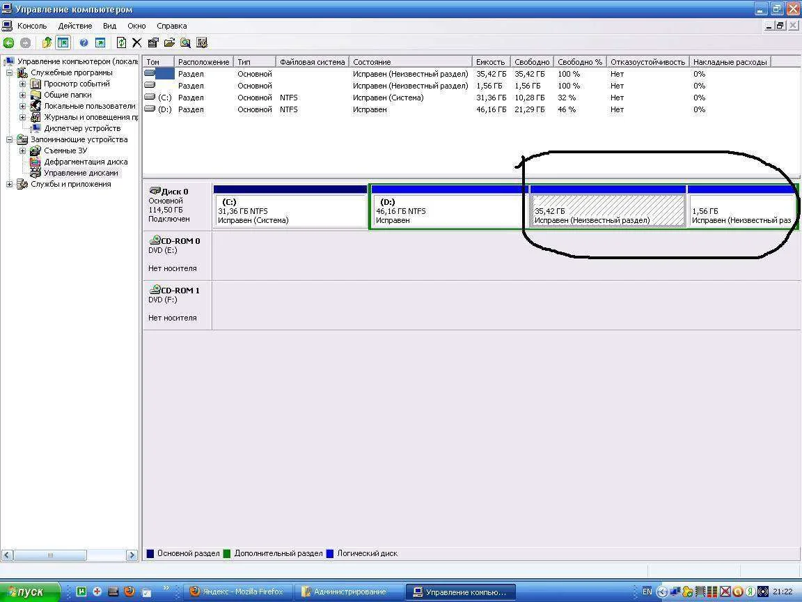Здравствуйте! У меня такая проблема: Установил 2 ОС UBUNTU, но при установке поленился в правильной разбивке раздела. загрузил автоматом. В результате ОС досталось 6.74 Гб, swat 380 мб ( оперативка 1.5 Гб),а root вообще ничего не досталось-30Гб просто не использовалось. Места системе не хватало. После очередного обновлени, или установки проги система перестала грузиться. Я не нашел ничего более умного, как в винде удалить эти разделы(большая глупость), до кучи удалил GRUB, естественно система вообще перестала грузиться. Спешно установил UBUNTU- всё стало грузиться, но разделы теперь выглядят так.
