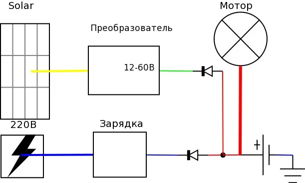 ага понятно, я вот про что говорил, представьте что у вас АКБ разражен, и солн. панель его заряжает, но помимо этого еще и питает мотор, вследствие недостаточный ток заряда АКБ, а его разряд через мотор так же продолжается. т.е. мотор будет питаться от разряженного акб и солн. панели. надо это исправить. чтобы в момент заряда акб. мотор питался от вашего бензогенератора исключая акб.