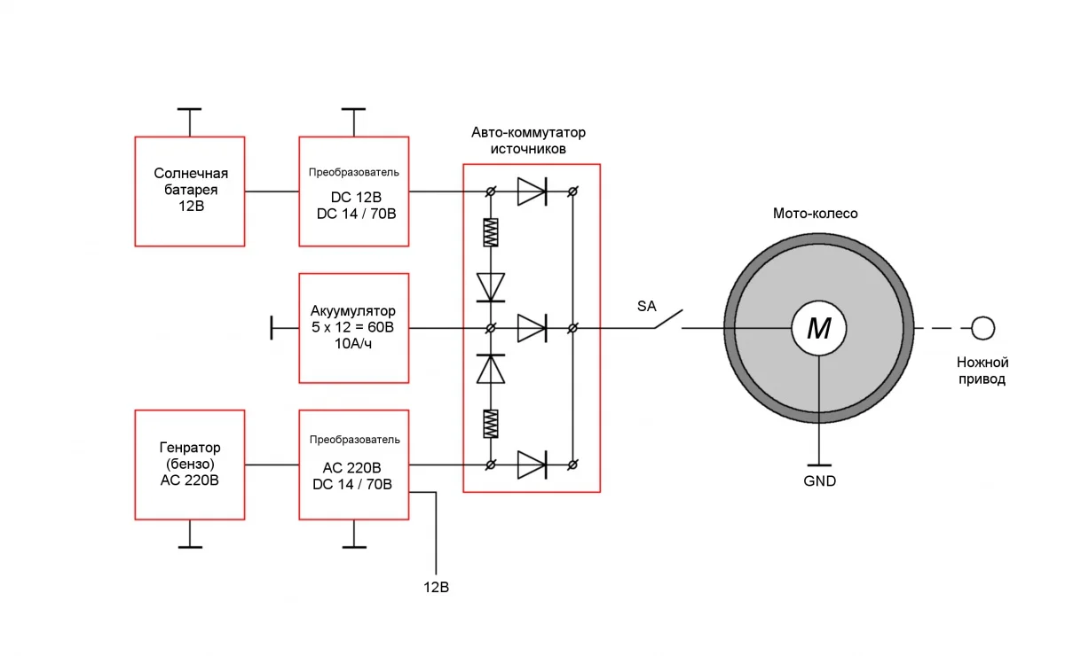все очень просто. зарядка на 220 идущая в комплекте к мотор-колесу и аккам. может включаться в любой источник 220В. будь то генератор в лесу, или розетка в придорожной кафушке.. таже , полагаю через диодную развязку, нужно подключить выход от преобразователя с защитой от перезаряда к аккамуляторам. дальше провода на колесо. где-то так.