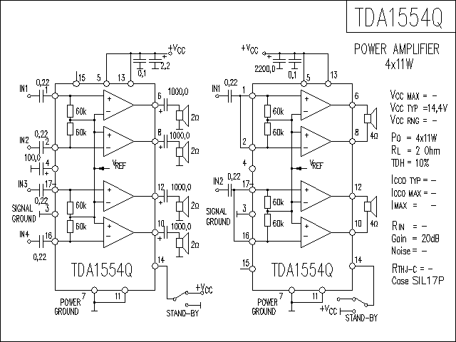 Два варианта включения -четыре канала по одиннадцать ватт или два канала по двадцать два ватта.