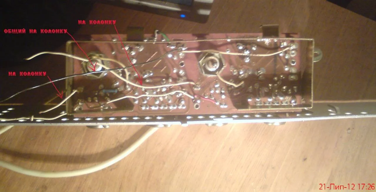 steeler1889 подключил так, работает) только один канал работал, играло целый день нормально, захотелось и второй сделать. Оказалось конденсатор расшатался и дорожка порвалась....припаял ее, и второй начал работать но хуже шума больше и чуть двинешь или тронешь плату то тише то громче становиться и пока так крутил то что то вообще шумно играть стало....теперь и тот что играл нормально стал с такими помехами что слушать невозможно....и теперь при отсоединении сигнальных проводов только при питании подключенном появился какай то шум ритмичный, как под счет РАЗ И ДВА И бьет какое то рыпение, от чего это?