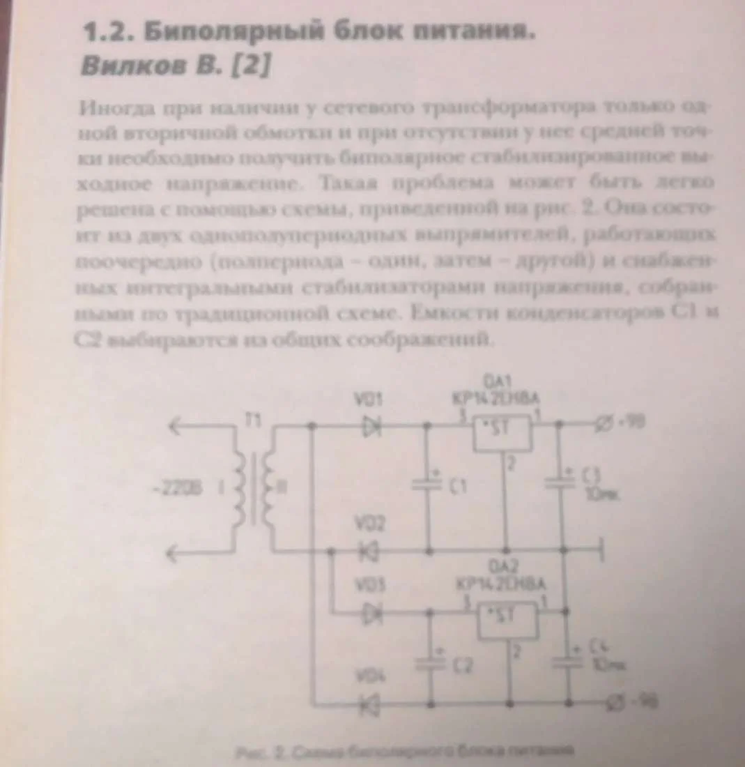Здравствуйте!!! Имеется транс на 14 вольт переменки с одно полярным питанием( выходит 2 провода из транса ). Подскажите как можно сделать двух полярное питание?????