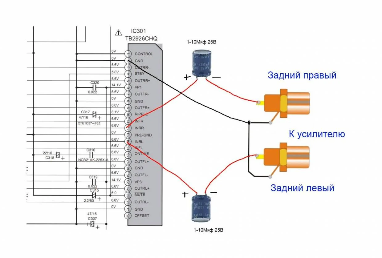 Только тут пишут что нужно электролит 1-10Мкф, а в другом месте написали "Там сморишь выводы микры. in1.....in4. Подпаиваешь к ним через 0,1-0,47мкф, если на саб то лучше 1мкф, неполярный керамический конденсатор."