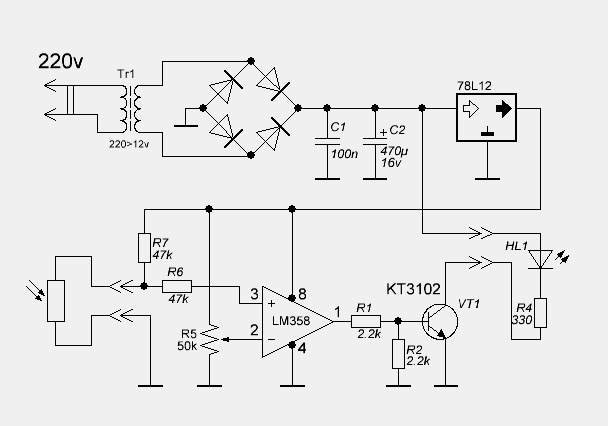 Как собрать простейшую схему фото реле для включение диодов в ночное время,питание от1,2 до 220 Вольт(в наличае куча готовых блоков питания)