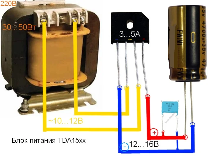 Блок питания такойНа данном усилителе нужно питание 14 вольт, написано на схеме. Тогда трансформатор покупать на 14 вольт и током ампер на 5? Или какой?