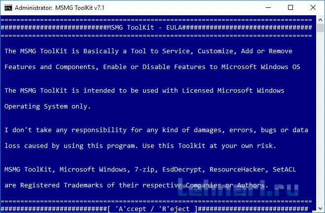 Распакуйте архив 7z (вам может понадобиться 7-Zip) с программой и запустите скрипт. Программа отобразит пользовательское соглашение, которое нужно принять для продолжения работы. В документе сообщается, что автор программы не несет ответственности за возможный ущерб или другие проблемы. Приложение представляет собой скрипт командной строки.