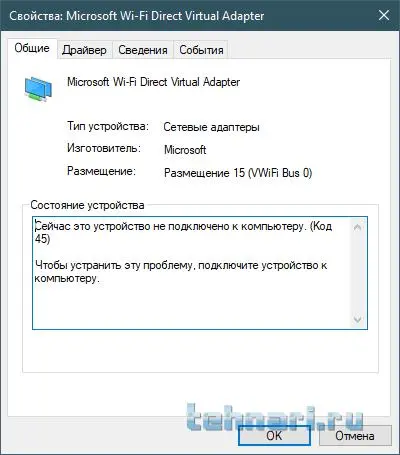 Скажите пожалуйста: у меня в скрытых устройствах отключен Microsoft Wi-Fi Direct Virtual Adapter (код 45) Как его включить? Все остальные беспроводные устройства работают нормально.