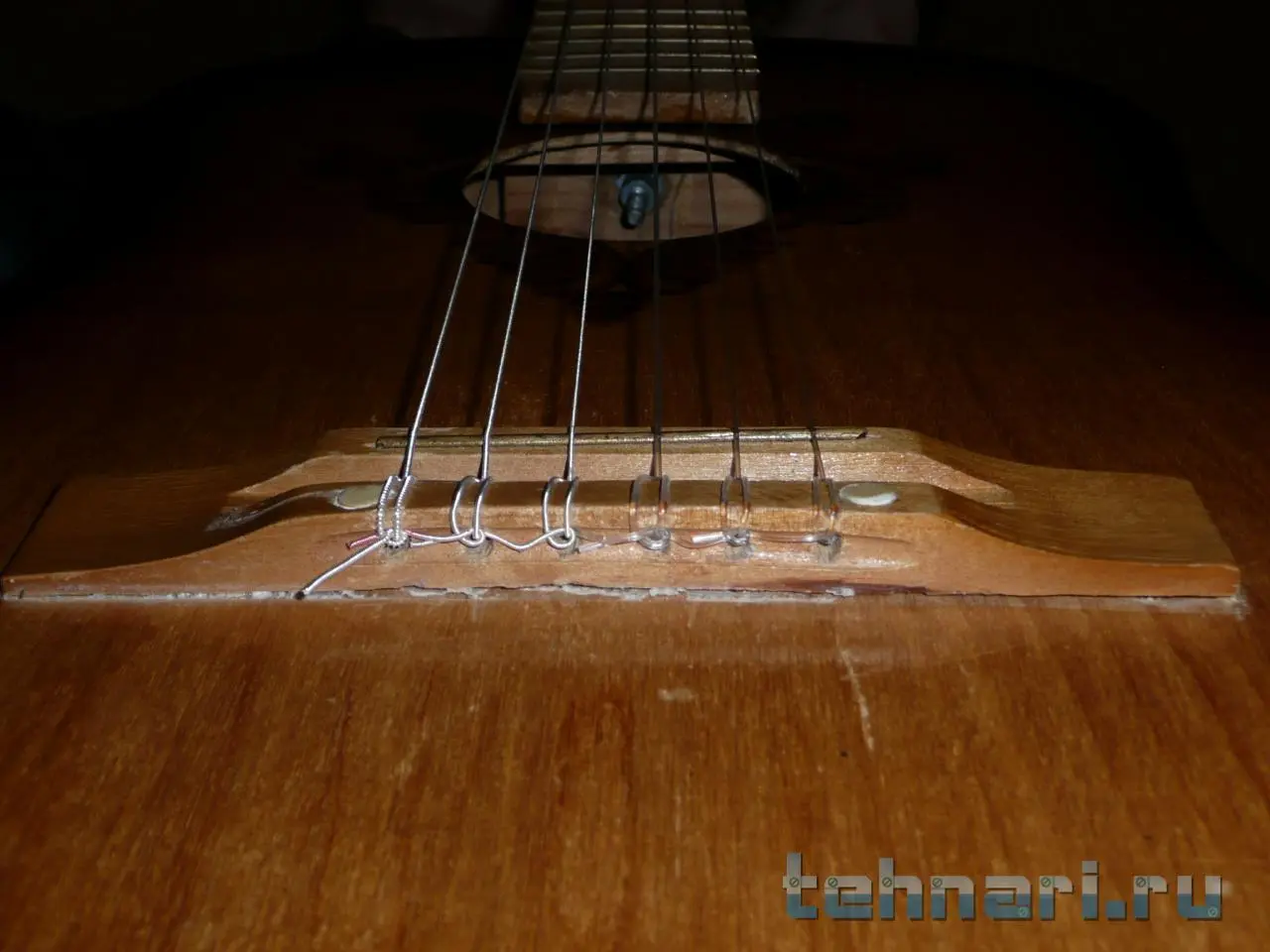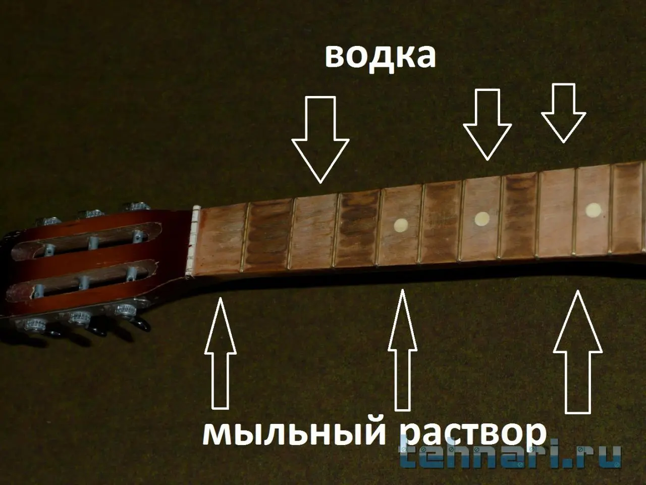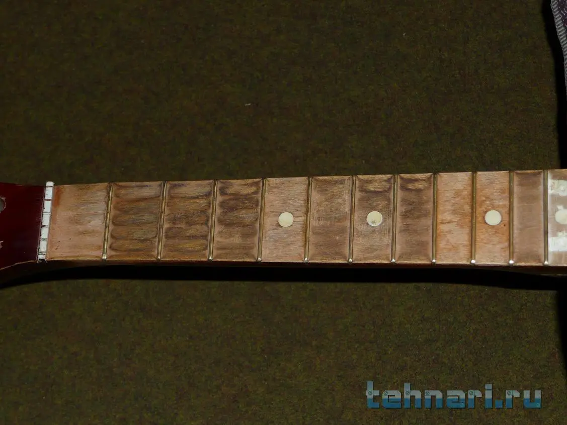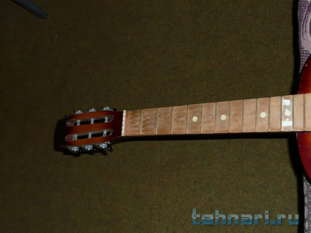 Гриф натирал мыльным раствором и водкой, как советовали в интернетах, разницы особо не увидел. На третьей фотке грифа видны следы от сотен пальцев (даже вмятины), но когда лады подсохли, перестали так бросаться в глаза. Струны натягивал дважды, в первый раз оставил хвосты снаружи, во второй раз заправил их под соседние струны для красоты :) Оба раза настраивал гитару на слух (даже ноту Ми) - ошибся незначительно :) Растем помаленьку, какой-никакой опыт набираем))))