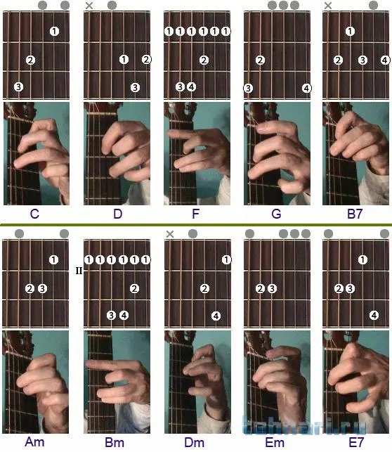 Леша аккордам тебе все ровно придется учиться. Вот постановка аккордов, которые в первую очередь учат, на октаву выше будет легче перейти ... :)