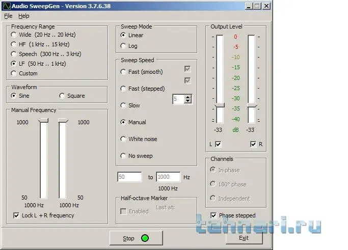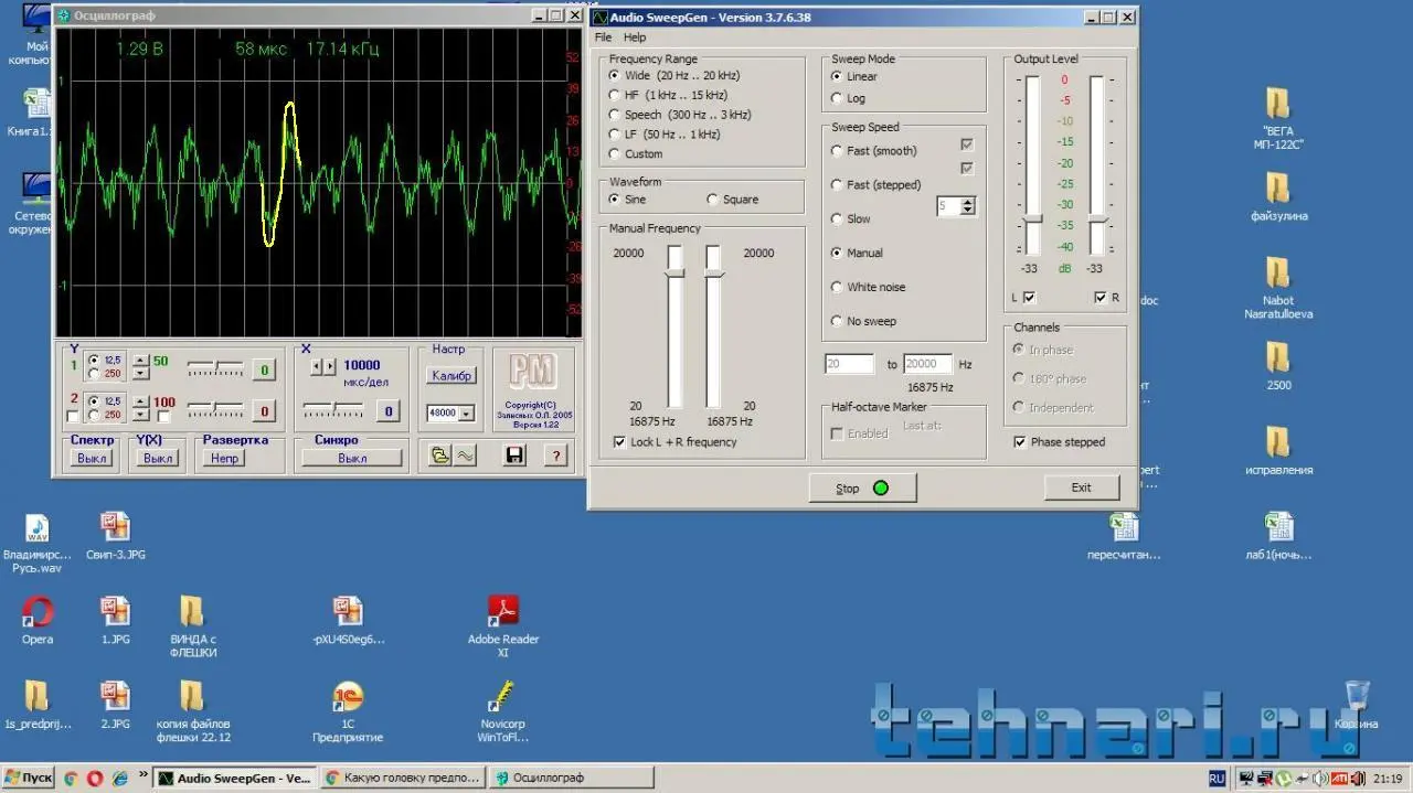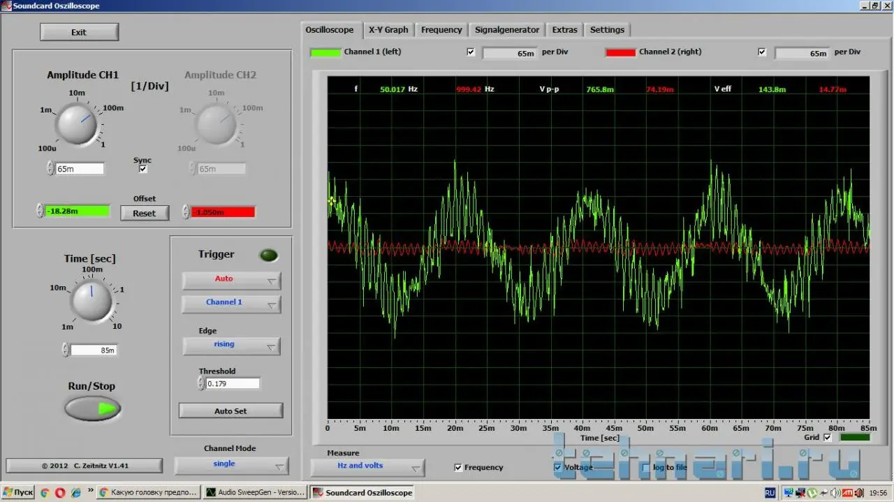 Так точно , с генератора дать примерно 1кГц и установить регулятором громкости компа уровень на мафоне примерно -5...-3 .должен запустить 2 программы: генератор и осциллограф